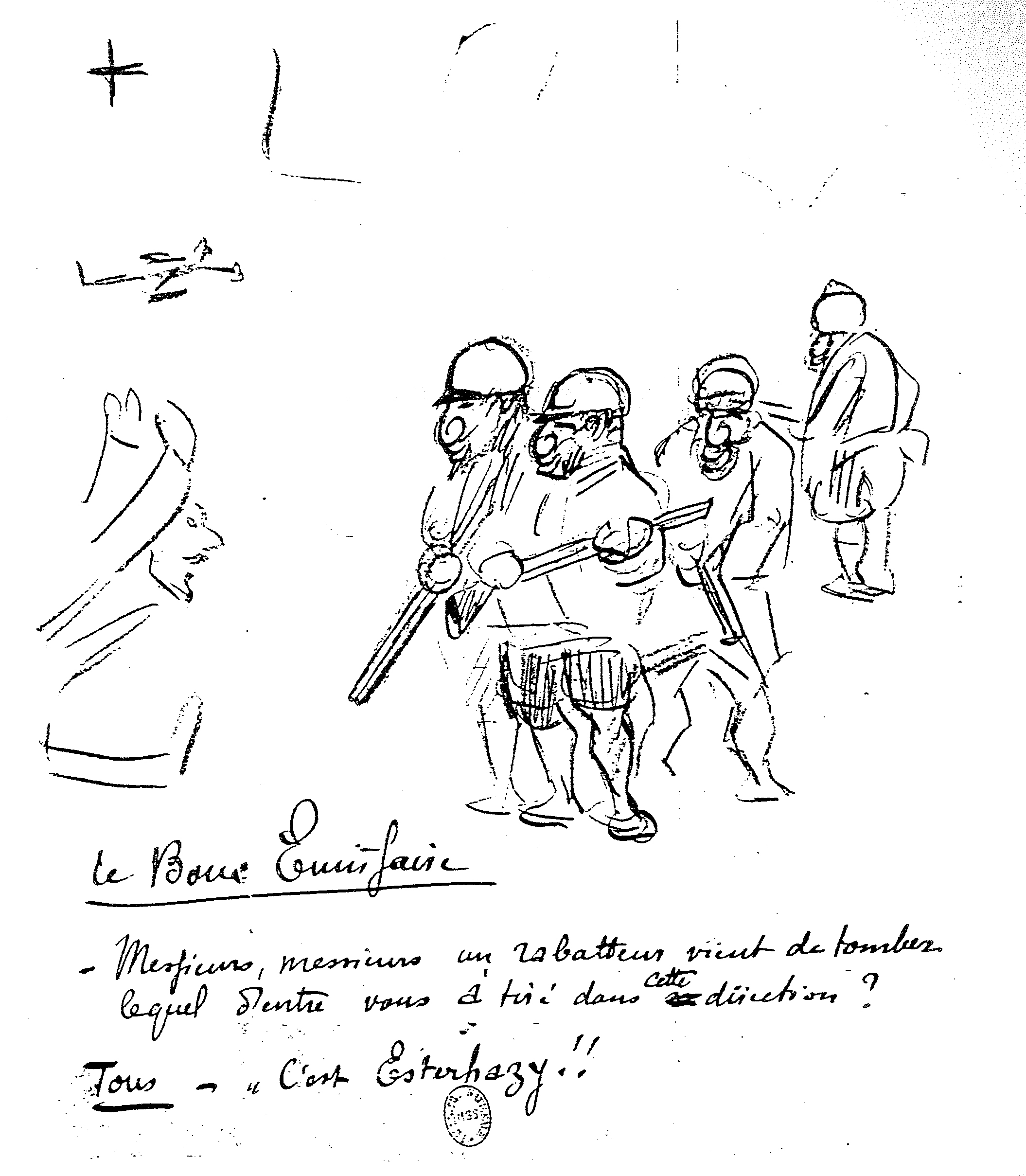 L’antisémitisme même meurtrier ne le gênait pas, comme nous avons pu voir dans l’extrait donné du 16 août ou dans son héroïsation de Guérin. Et s’il n’était pas question de devenir directeur d’une revue qui n’existait que pour l’antisémitisme et par l’antisémitisme, rien ne l’empêchait de s’affirmer publiquement comme tel comme dans ce « Parallélisme. Fils de Preux » ou dans ce projet, sans suite, qui avait été le sien de réaliser un numéro dédié à la question pour la revue L’Assiette au Beurre. Cette même année 1903, il proposera ainsi à Samuel Schwarz, qu’il présentait à Léon Bloy comme « d’importation récente » (lettre du 25 avril 1903. Cahiers Léon Bloy, n° 5, mai-juin 1933, p. 68), « en qualité de Youdi […] également dreyfusard » (ibid., p. 71), un projet de numéro qu’il avait titré « Nos Maîtres ». Un des dessins y avait trait à l’Affaire :