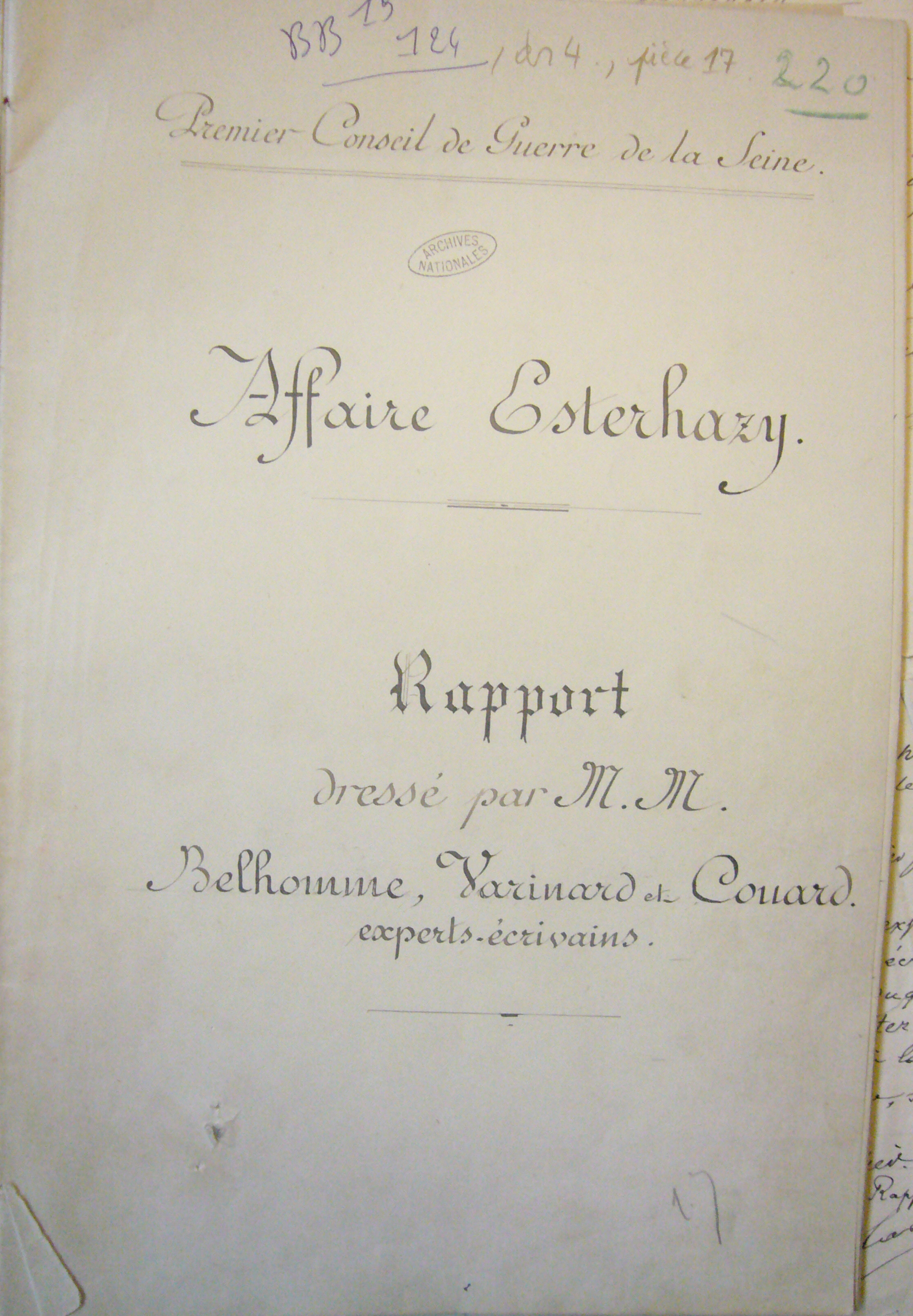 Un inédit : les rapports des experts de 1897 et 1898 (instruction et procès Esterhazy) Images en grand format : clic droit et « ouvrir dans un nouvel onglet » Source : AN BB19 124.