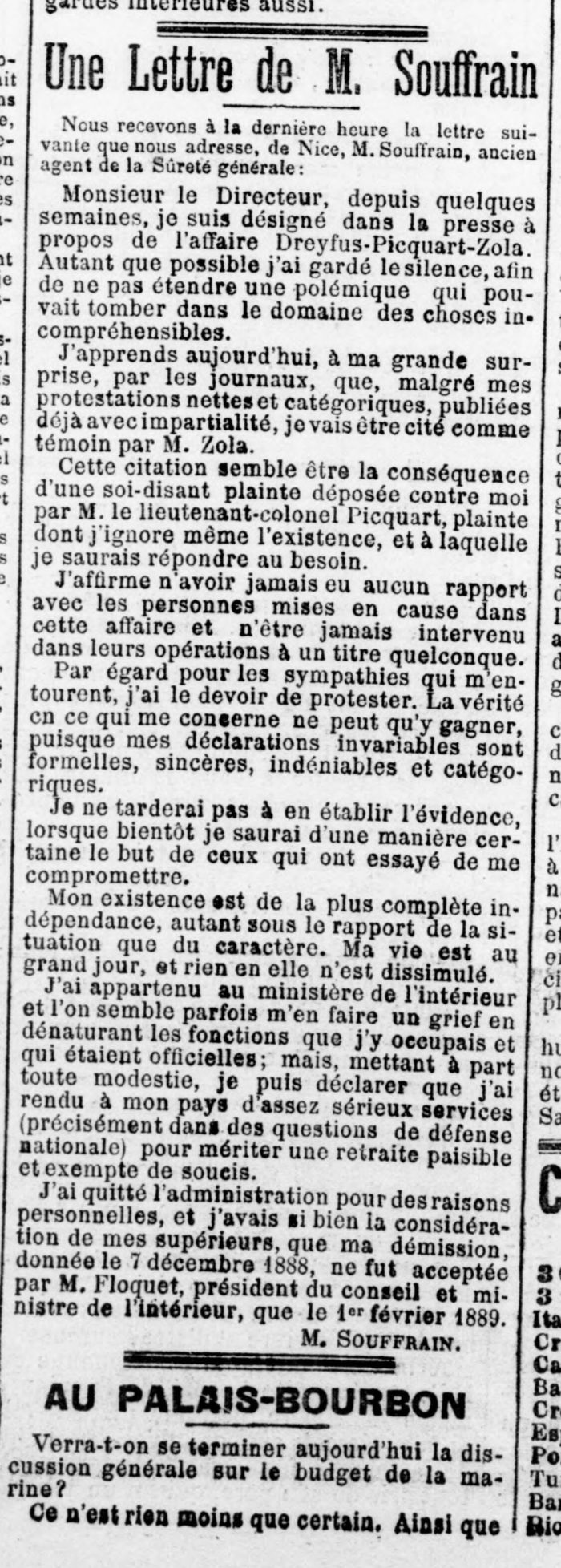 À plusieurs reprises, Souffrain est appelé à la barre [du procès Zola], mais il reste introuvable. « Quant à Souffrain on ne sait pas où il est… », se lamente le Président de la Cour.